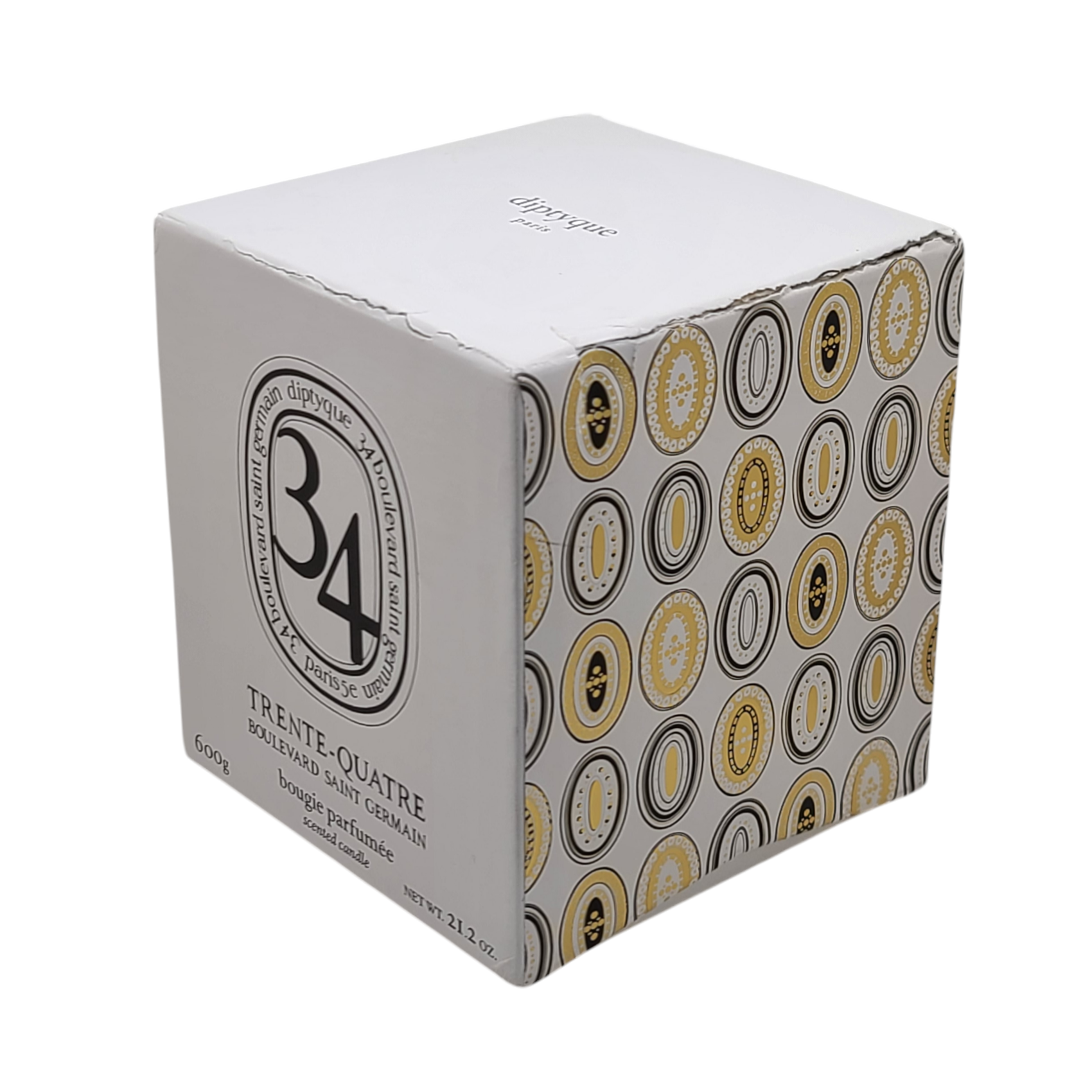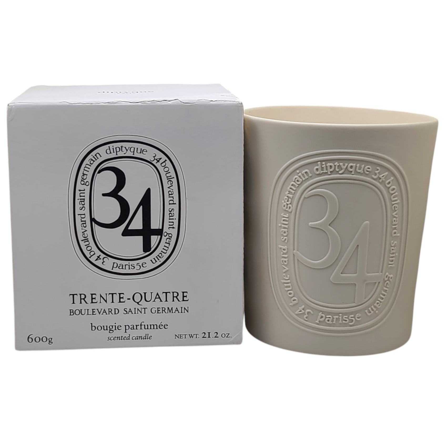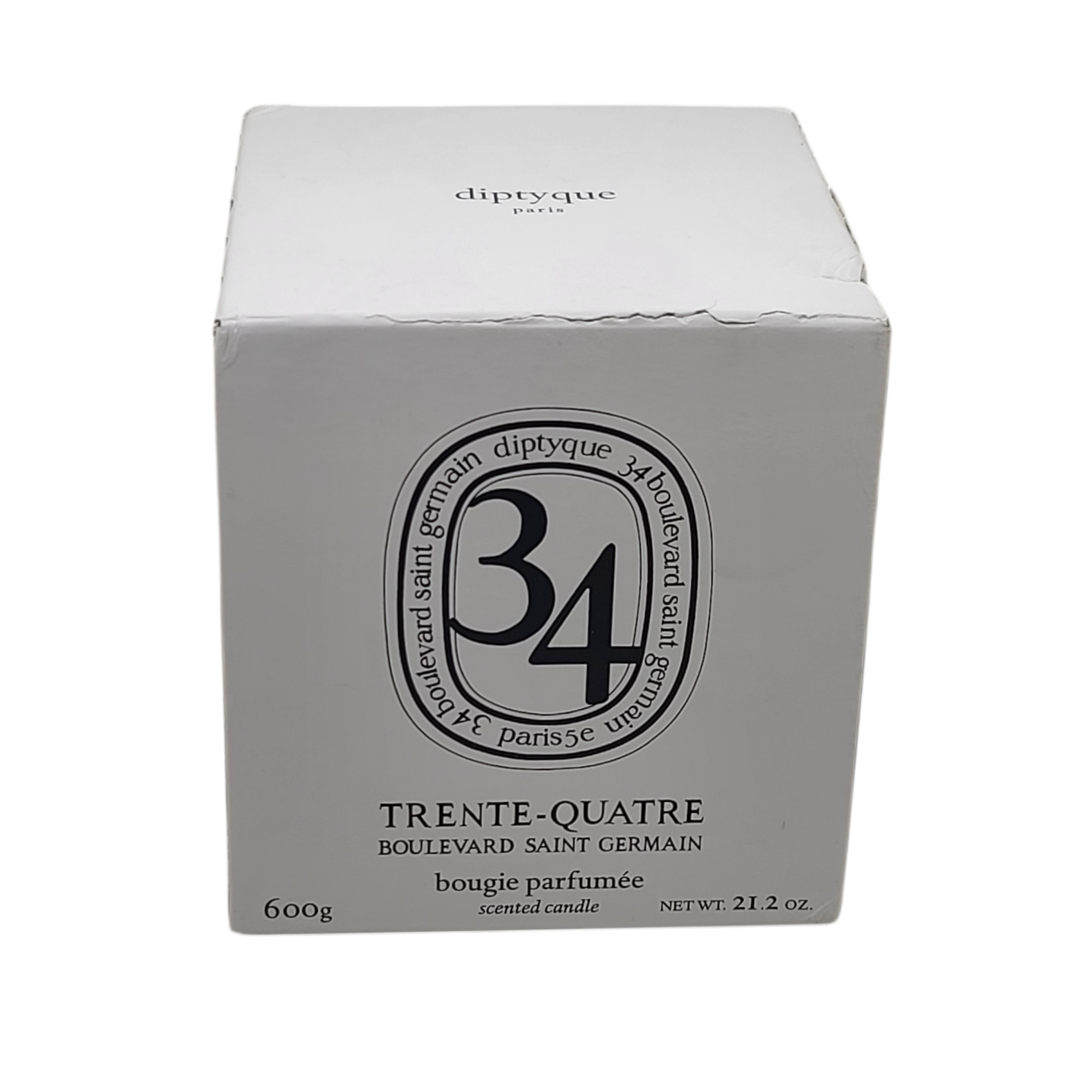 This Diptyque 34 Boulevard Saint Germain Candle 21.2oz/600g is Brand New and has Never been lit. The box is slightly torn and there are slight marks on the bottom of the candle. You will receive what is pictured. ** A candle with a fragrance celebrating diptyque's 50th anniversary. Fragrance story: 34 encapsulates the scent of diptyque's first boutique located on 34 Boulevard Saint Germain with rare and precious fragrances. The result is a fragrance that has an innovative and complex signature that is neither feminine nor masculine. The 34 Boulevard Saint Germain candle has a scent that reveals itself as fresh, green and spicy accords. Damp mosses, crumpled blackcurrant leaves, sun-dried fig leaves; all favorite raw materials. Contained in an oval-shaped porcelain jar made by hand. How to use: The first time you burn your diptyque candle, allow it to burn for at least two hours until the whole top is liquid with wax to help your candle burn more evenly next time. Before lighting, trim the wick to 1/4-inch length, which will allow the candle to burn slowly and will help avoid unsightly black marks around the edge of the glass. After blowing out your candle, re-center and straighten the wick.