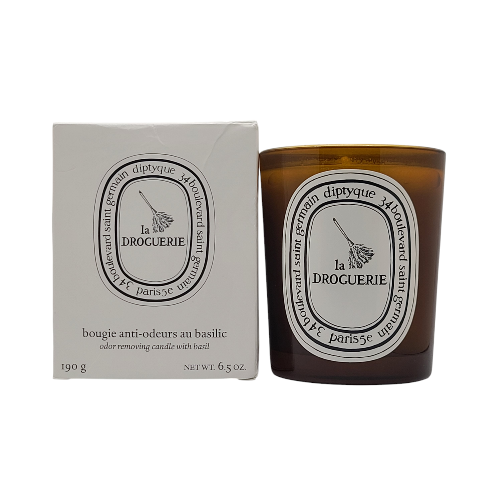 Diptyque 6.8 oz. Odor Removing Candle with Basil Perfumes and eliminates unpleasant odors. Unlike other Diptyque candles, the odor-removing candle with basil is based on a technology that targets and eliminates the molecules responsible for unpleasant odors. It replaces them with green and aromatic combinations of basil, mint, and tomato leaf. A window onto a fresh and colorful vegetable garden. La Droguerie Collection: From the bedroom to the living room, from the entryway to the bathroom & ml.